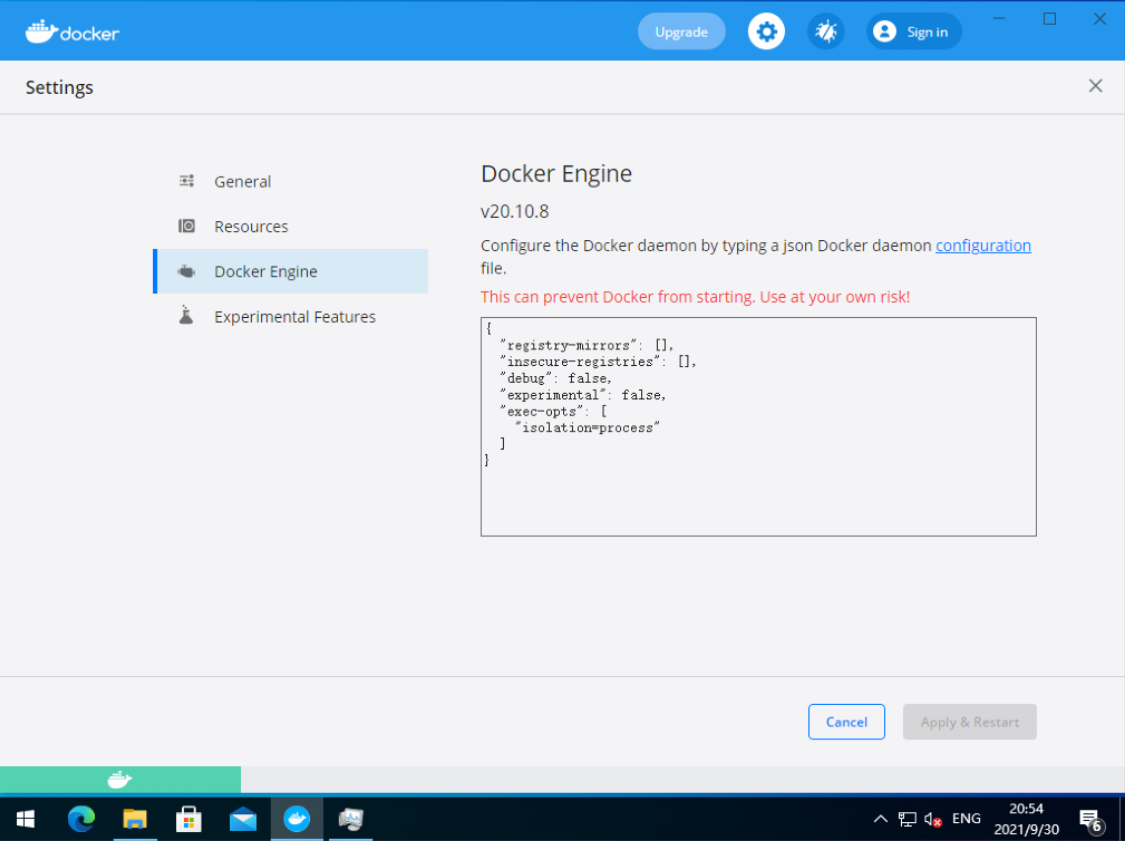 设置 docker for windows, 使用 process 来隔离, 因为kvm上的某种未知配置错误,默认hyper-v形式的隔离,启动不了容器,我们换成process来隔离.