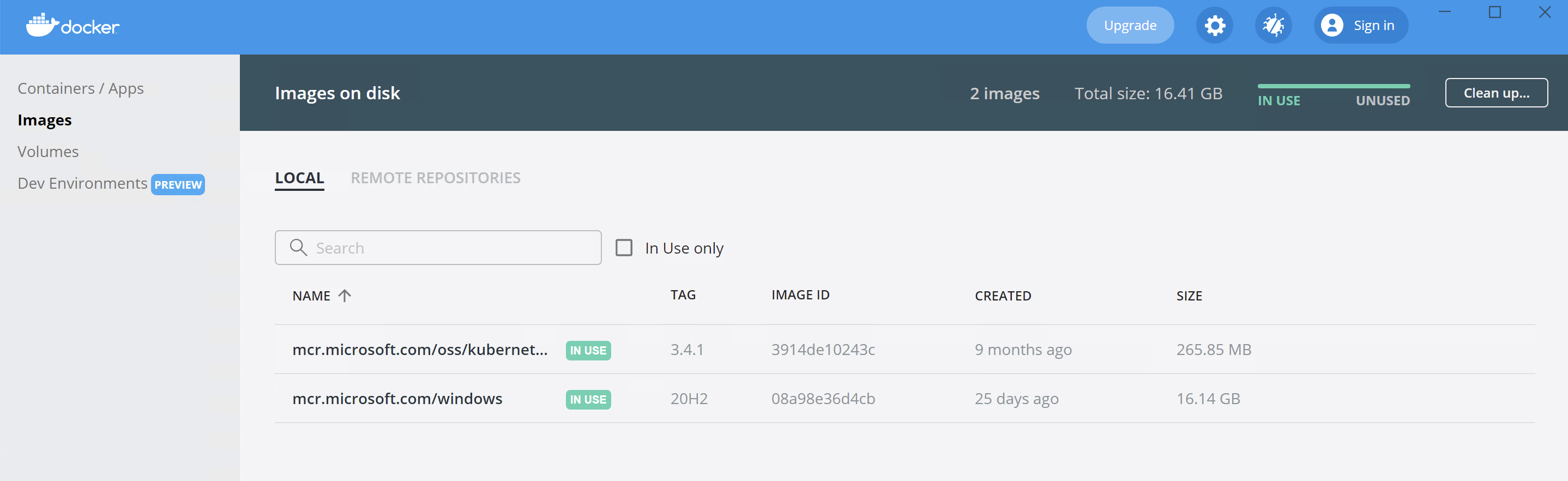 同样,在docker界面上,我们能看到他下载了2个镜像,并且正在使用中。