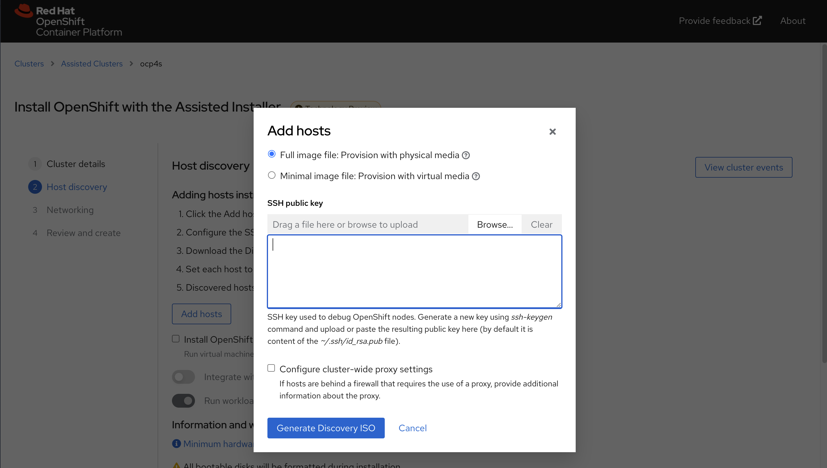 直接点击generate discovery iso,我们会在后面定制ssh key,现在不需要配置。
